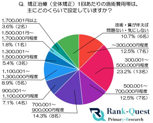 そこで本記事では、SEO対策で検索順位No.1を獲得した実績(注)を持つランクエスト(https://rank-quest.jp/column/column/how-to-seo/ )が、歯科矯正治療を提供している独立開業歯科医師56名及び実際に治療を受けた患者200名を対象に、「施術費用の設定状況」と「患者が妥当と感じる価格帯」に関するアンケート調査を実施。