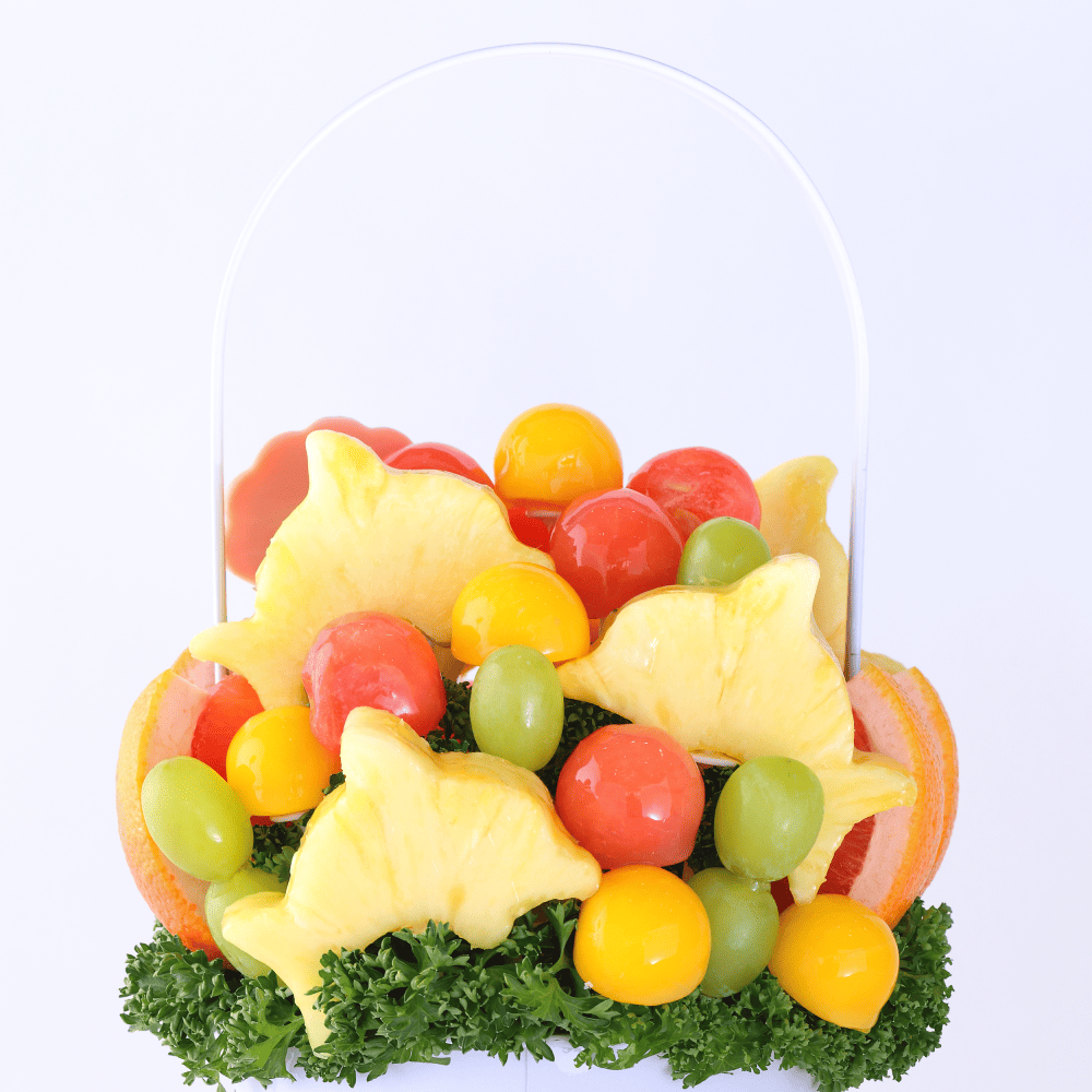 フレッシュなパイナップルやメロン、オレンジなどを丁寧にカット・アレンジメントし、アクセントとしてチョコレートの貝殻型のモチーフを加えた、ユーモアと涼感あふれる逸品です。