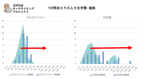 プロジェクトの成果として、クラス全体の1分間あたりの入力文字数の平均値が実証開始月には55.8文字だったのが75.2文字となり、3か月間で19.4文字アップ。入力文字数の分布を見ても、クラス全体でタイピングスキルの向上、底上げがされたという結果を得ることができました。
