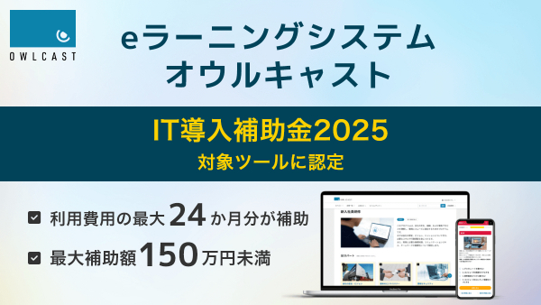 これにより、条件を満たした事業者さまは『オウルキャスト』の導入費用の一部に対して、1/2~2/3以内(最大150万円未満)の補助金を受けることが可能になり、初期導入時の費用を大幅に抑えながらeラーニングシステムの導入・構築を実現することができます。