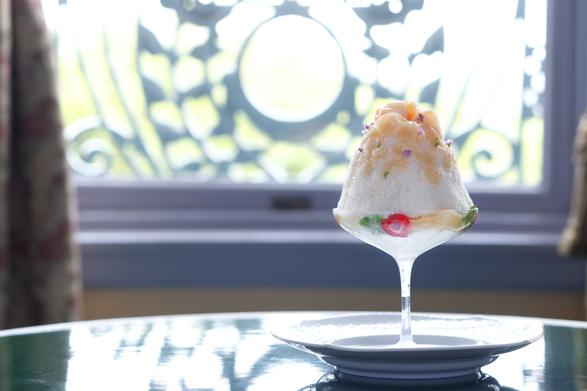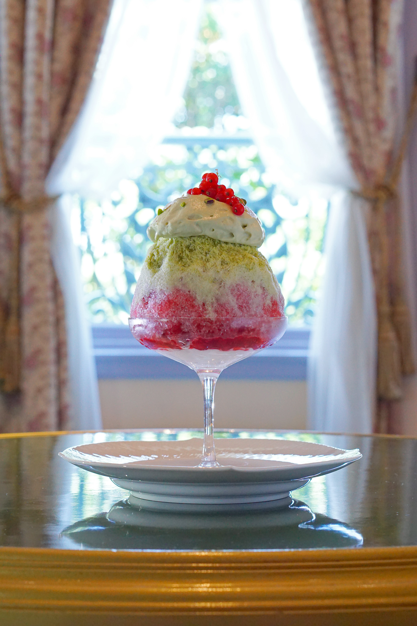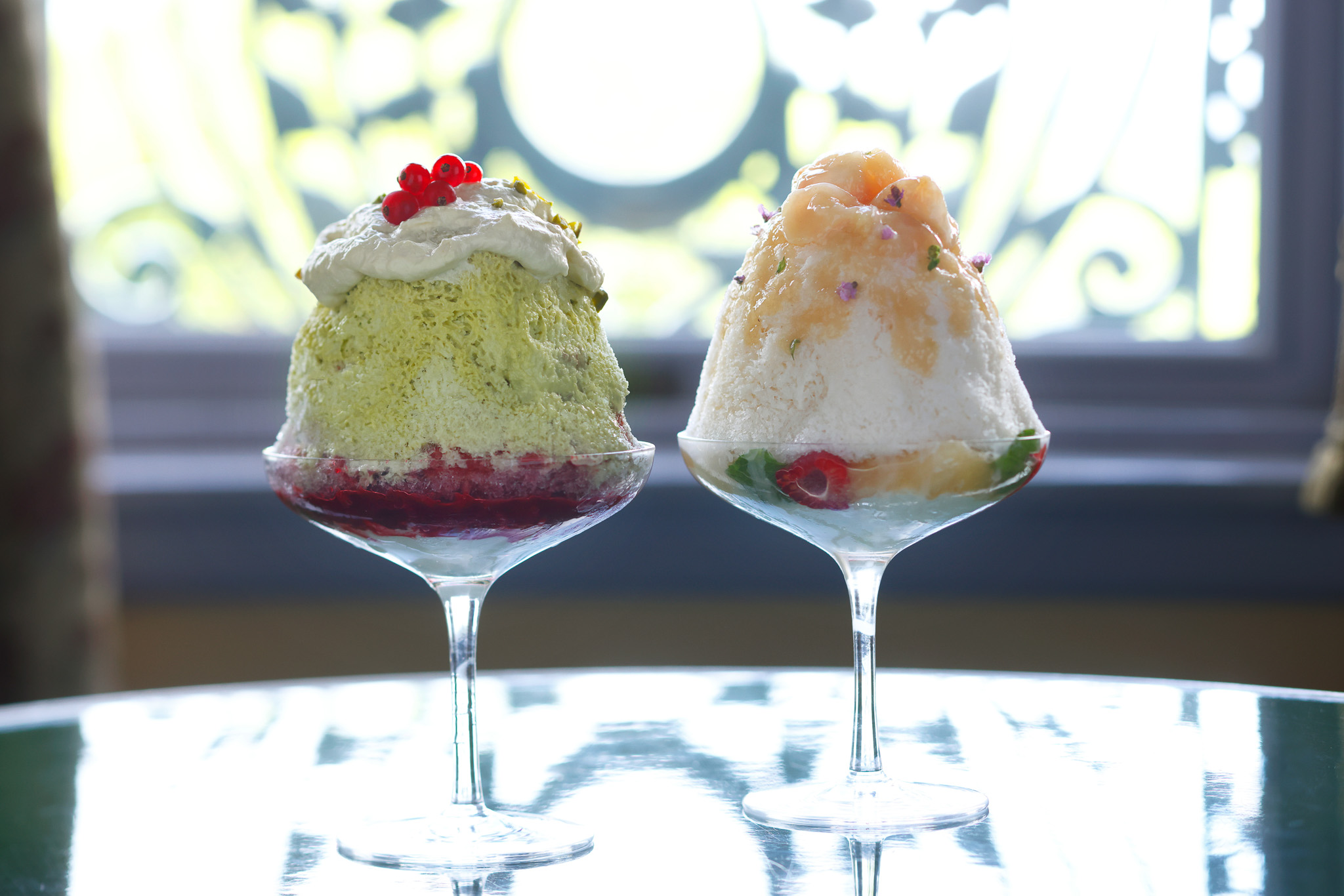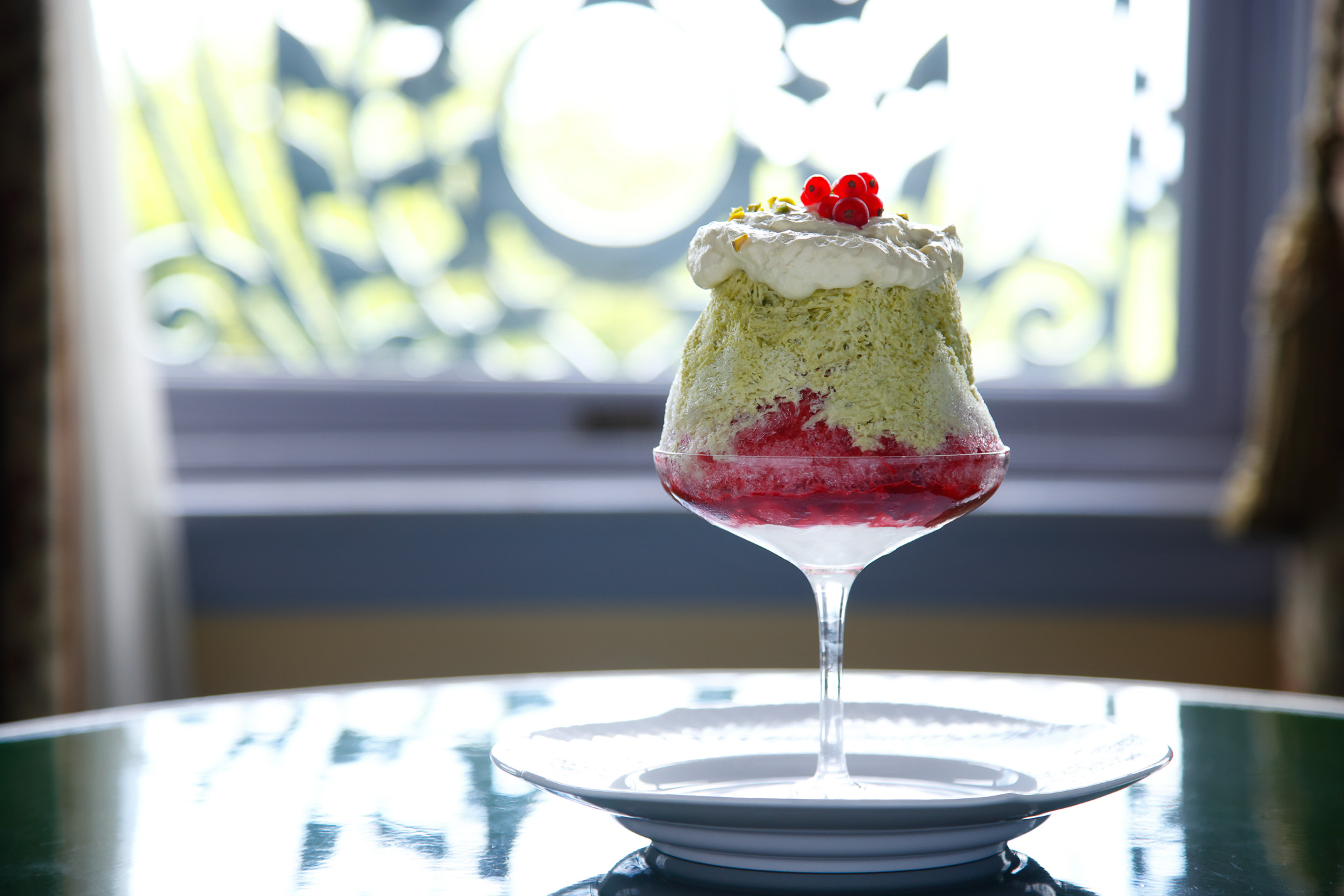 グラスの底にはオレンジリキュールのシロップを含ませたブリオッシュ生地、フランボワーズ果肉、ピスタチオのエスプーマクリーム。その上に、細かく削った氷にピスタチオの濃厚な練乳ソースと甘酸っぱいフランボワーズソースを幾層にも重ね、トップにはなめらかなピスタチオのエスプーマクリーム、赤すぐりを添えて、華やかに仕上げました。