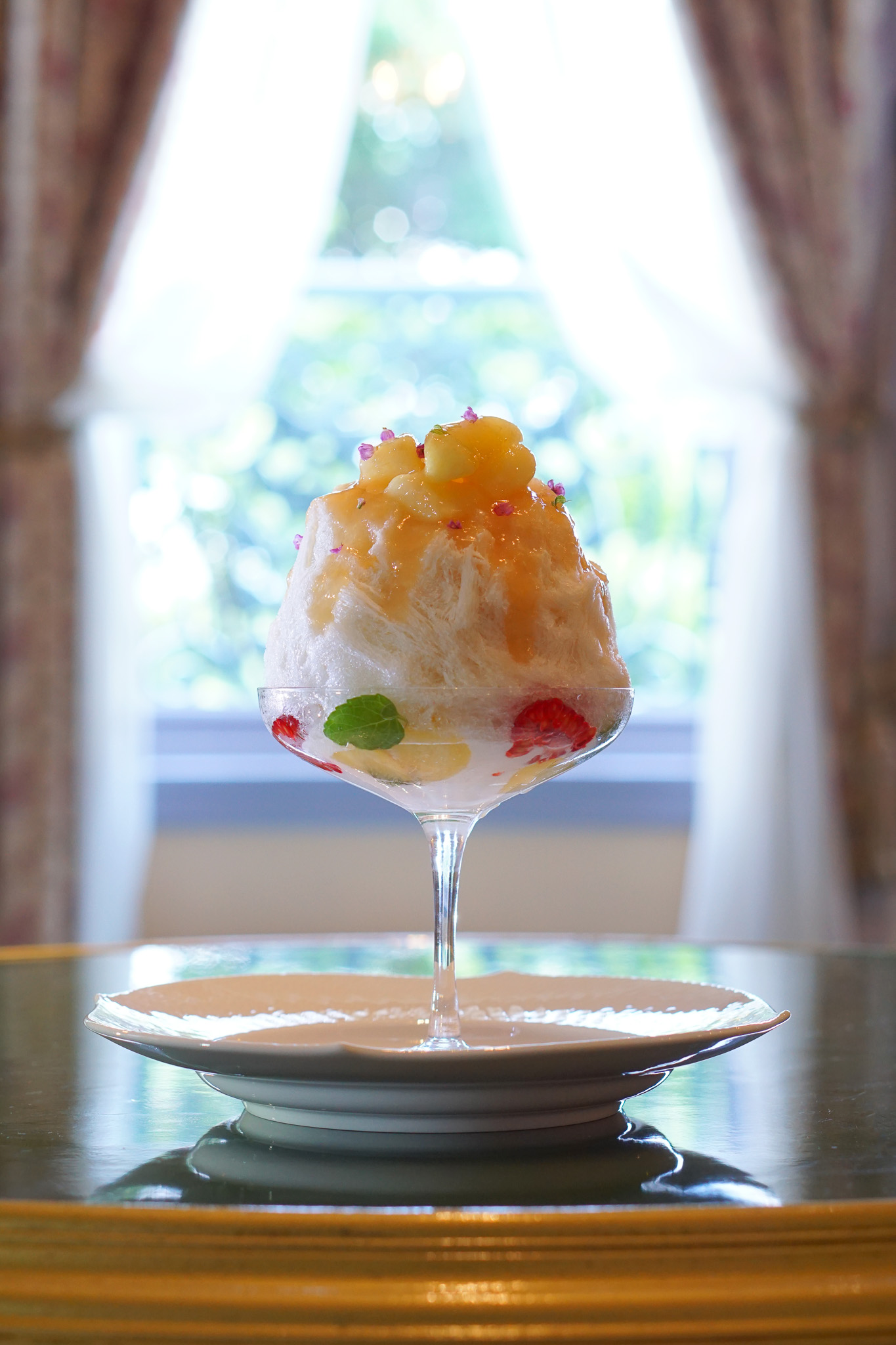 山梨県産の白桃の豊潤な甘さと紅茶香る練乳の甘さ、ミントの清涼感が味わいです。