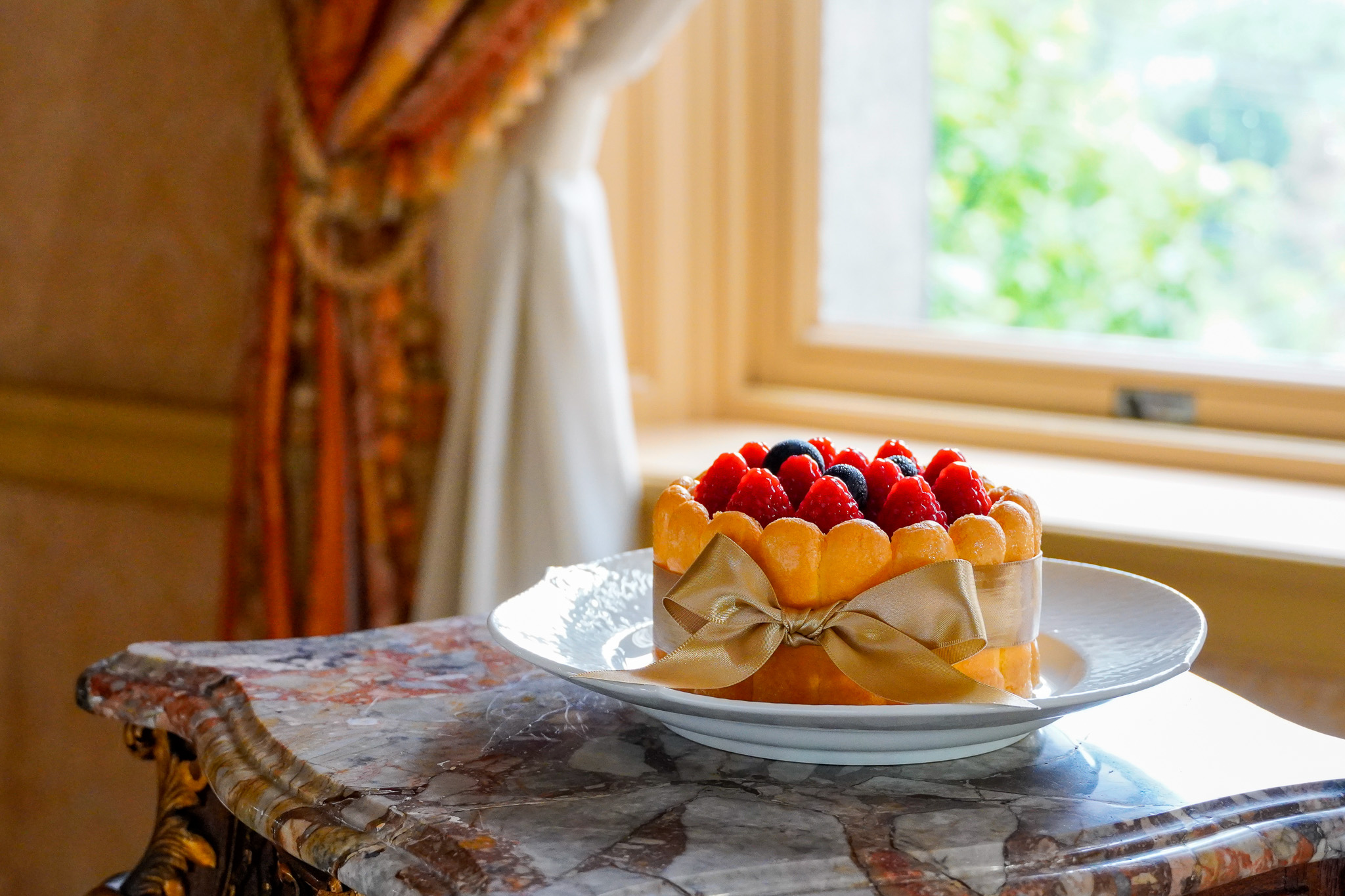 バニラの甘く魅惑的な香りに、柚子の澄んだ余韻。フランボワーズのやわらかな酸味を重ね、たまごのやさしい香りのビスキュイでそっと包んだ、長楽館らしいシャルロットです。