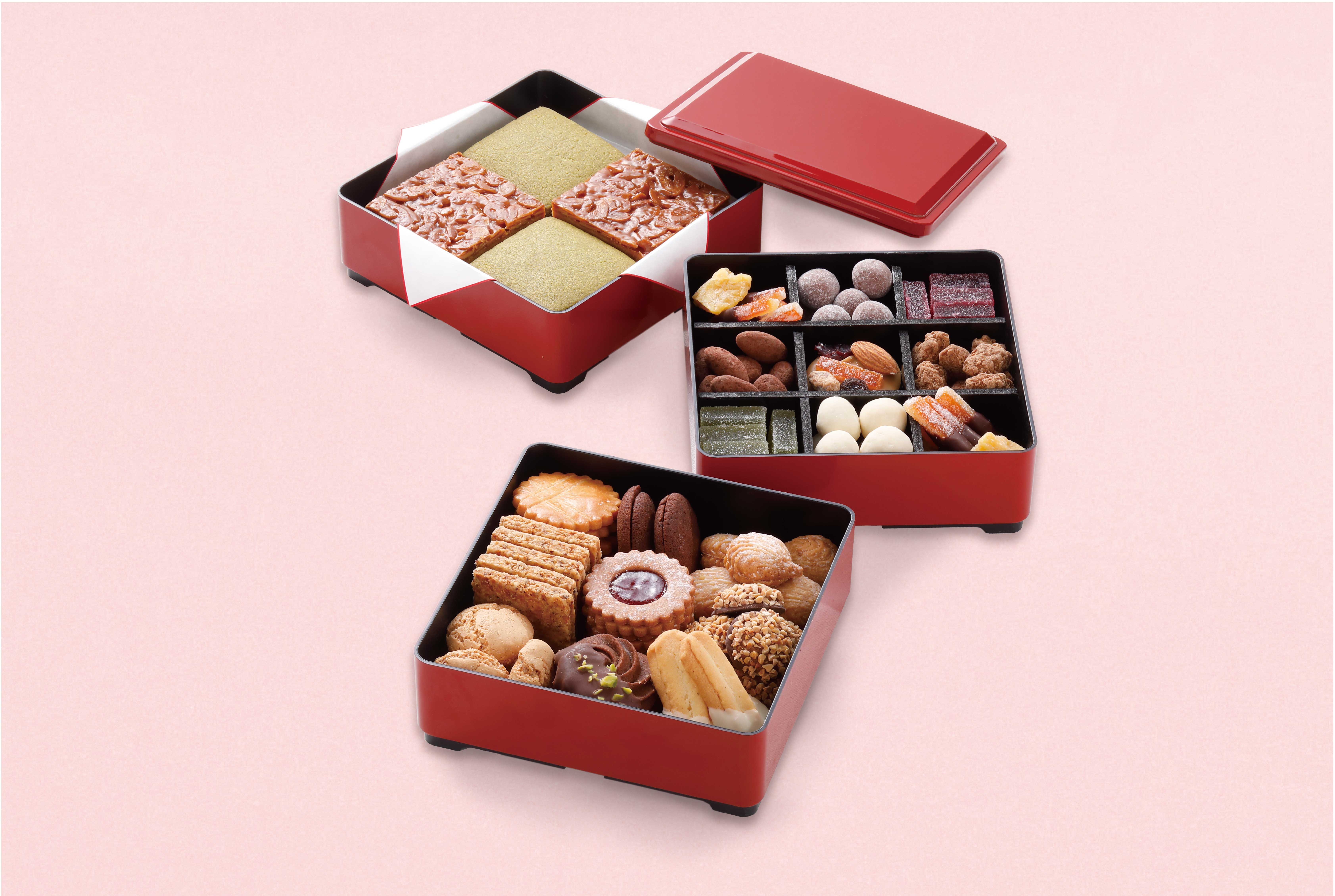 多彩な味わいや食感を詰め込んだ3段重は、クッキー、ナッツショコラ、パート・ド・フリュイなどをバランスよく詰め合わせ、新春を祝う華やかなひと箱に仕上げます。