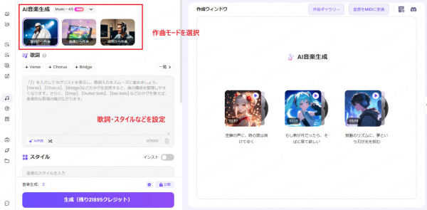 「説明」「画像」「歌詞」など、お好みの音楽生成モードを選びます。歌手選択機能はすべてのモードで利用可能です。