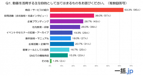 最も多かったのは「商品・サービスの紹介」(63.3%)で、全体の6割以上が動画を自社の商品やサービスのPRに活用していることがわかります。