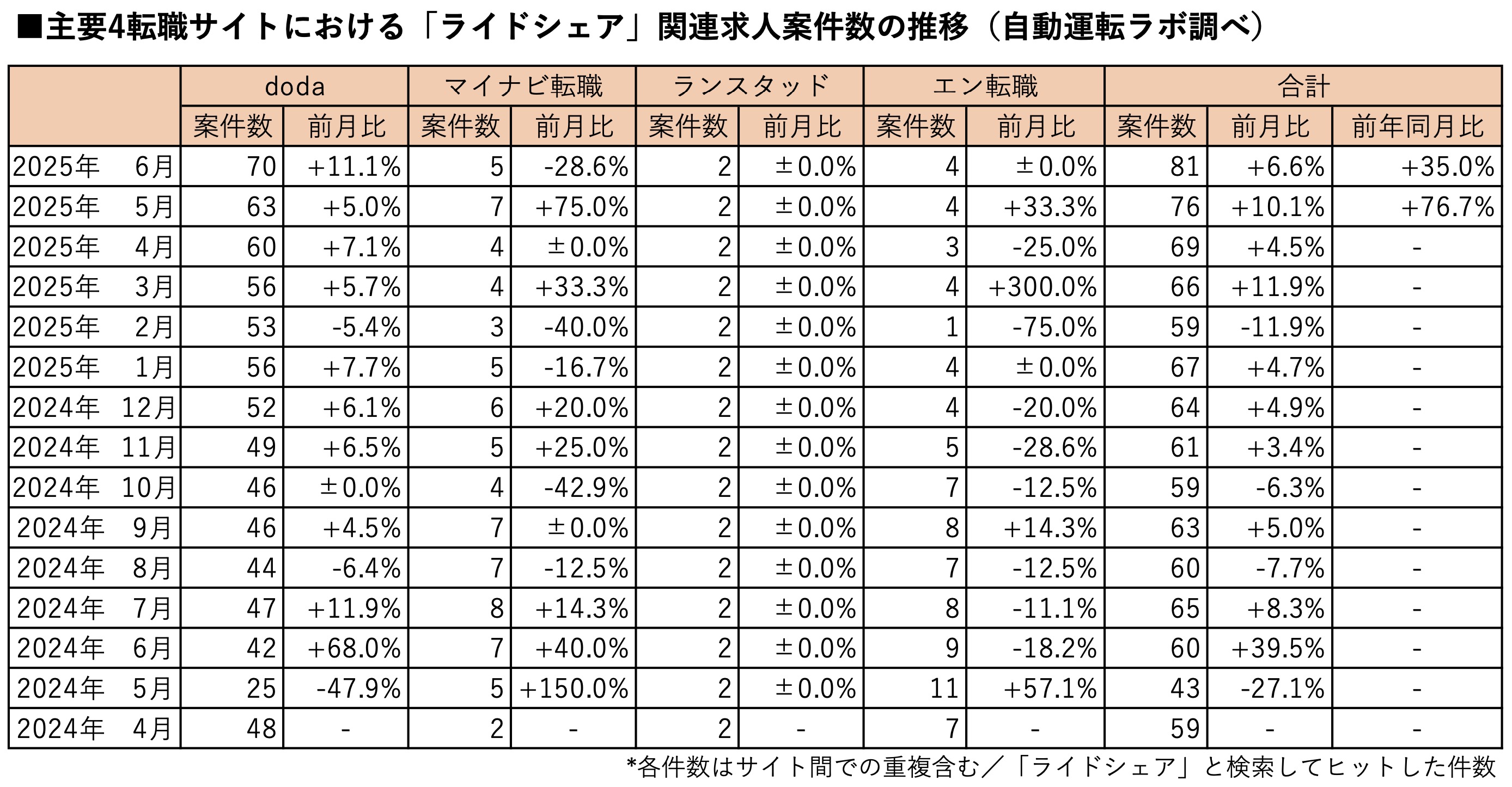 主要転職4サイトにおけるライドシェアの関連求人案件数(※「ライドシェア」と検索してヒットした求人)は2025年6月末時点で前月比6.6%増、前年同月比35.0%増の81件となりました。前月比での増加は4カ月連続となります。