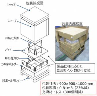 本改善により、包材(緩衝材)レスにより包材によるCO2排出量を約60%削減、容積率向上と開梱作業時間の削減を実現、また段ボールホルダーの内装仕切りを可変式として、部品の形状が異なっても1種類の包装へ統合可能としています。