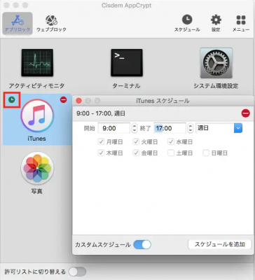 7. また、アプリを特定の時間帯でロックする必要のある場合、右上の「スケジュール」アイコンをクリックして一般スケジュールを設定できます。