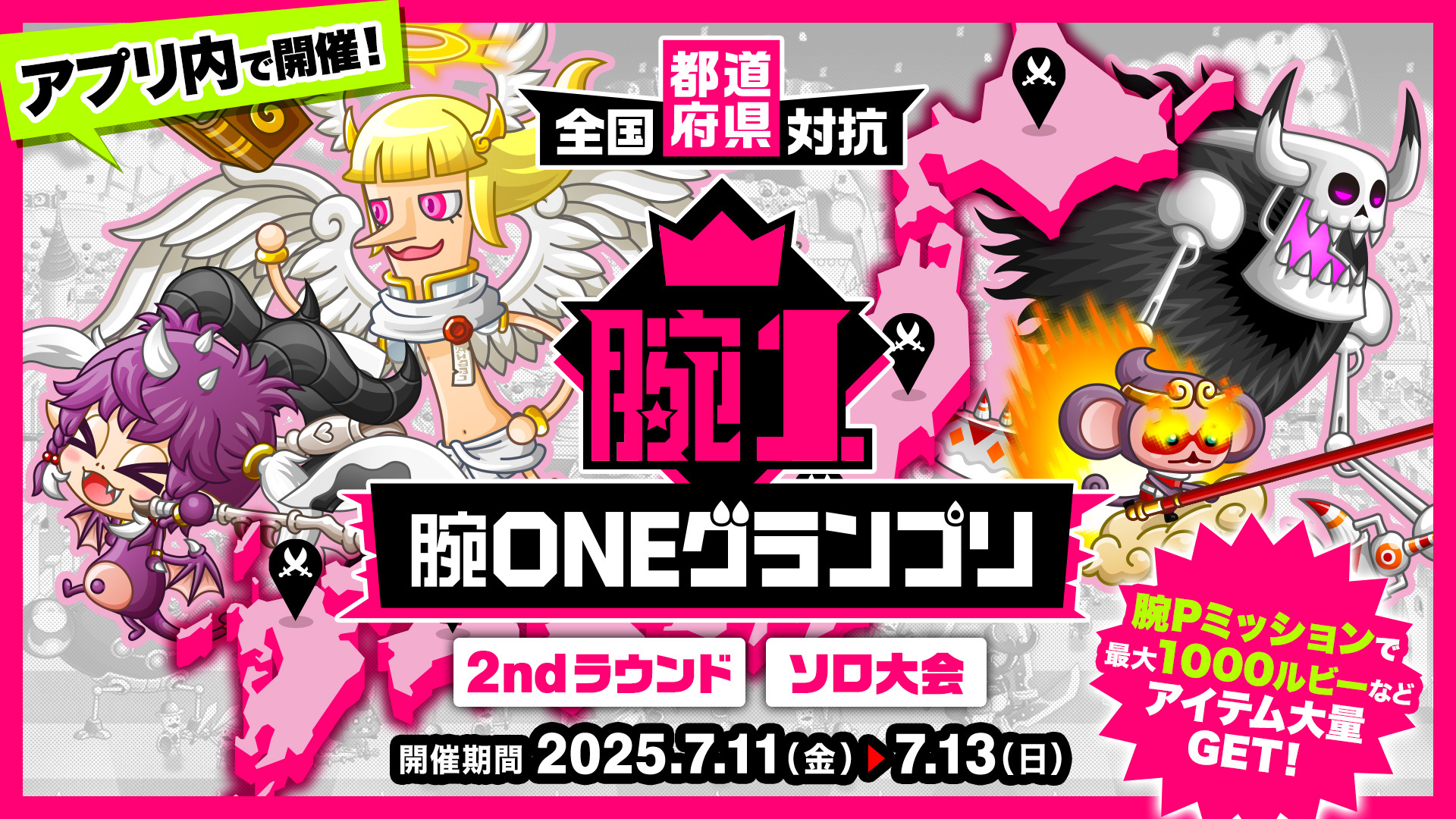 2025年7月11日(金)6:00より、「全国都道府県対抗腕ONEグランプリ 予選2ndラウンド[ソロ大会]」をアプリ内で開催いたします。予選は全『城ドラ』ユーザーが参加可能!今回はアプリ内で現在お住いの都道府県を自己申告し、バトルに挑んでいただく形となります。上級者VS初心者でも選択できるキャラ数や育成による差がなく戦える“腕ONEグランプリ”モードでのバトル。挑むほど達成でき、最大1,000ルビーや育成アイテムなど報酬がたっぷりもらえる「腕Pミッション」も同時開催!みなさまのご参加をお待ちしております。