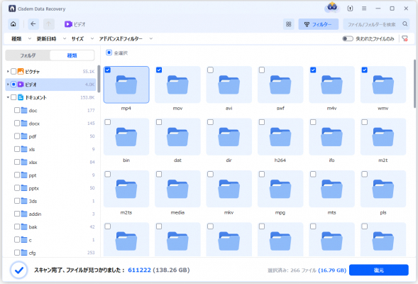 ●削除した/消えた写真、音楽、動画、ドキュメントなど1000以上の形式のファイルを復元