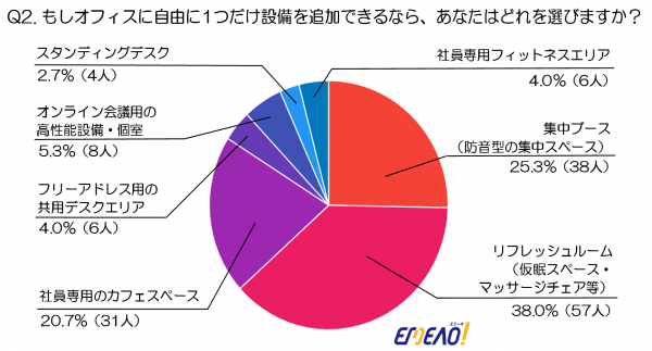 次いで「集中ブース(防音型の集中スペース)」が25.3%(38人)、「社員専用のカフェスペース」が20.7%(31人)となっており、業務に集中できる空間や、リラックスできる場所を求める声が多い結果となっています。