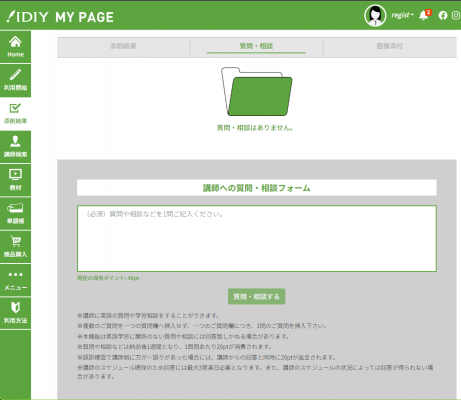 本サービスでは、添削を担当した講師に直接、学習方法の相談や具体的な質問が気軽にでき、英語学習の課題をその場で解決できます。料金は1回20ポイント(=178円(税別))とリーズナブルで、必要なときに必要なだけ講師へ相談できるため、より質の高い学習体験を継続的に得られるのが特長です。「アイディー」は今後も、ユーザーが目標達成へ最短距離で進めるようサポートを続けてまいります。