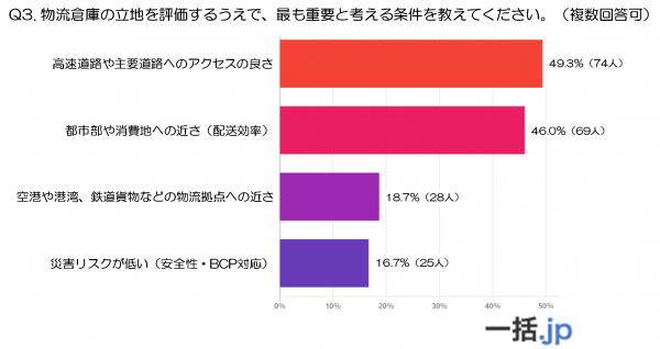 次いで多かったのは「都市部や消費地への近さ(配送効率)」で46.0%(69人)となっており、消費地までの距離が短いほど配送コストや時間が削減できる点が評価されています。都市部へのアクセスのしやすさも、物流戦略を考えるうえで欠かせない要素です。
