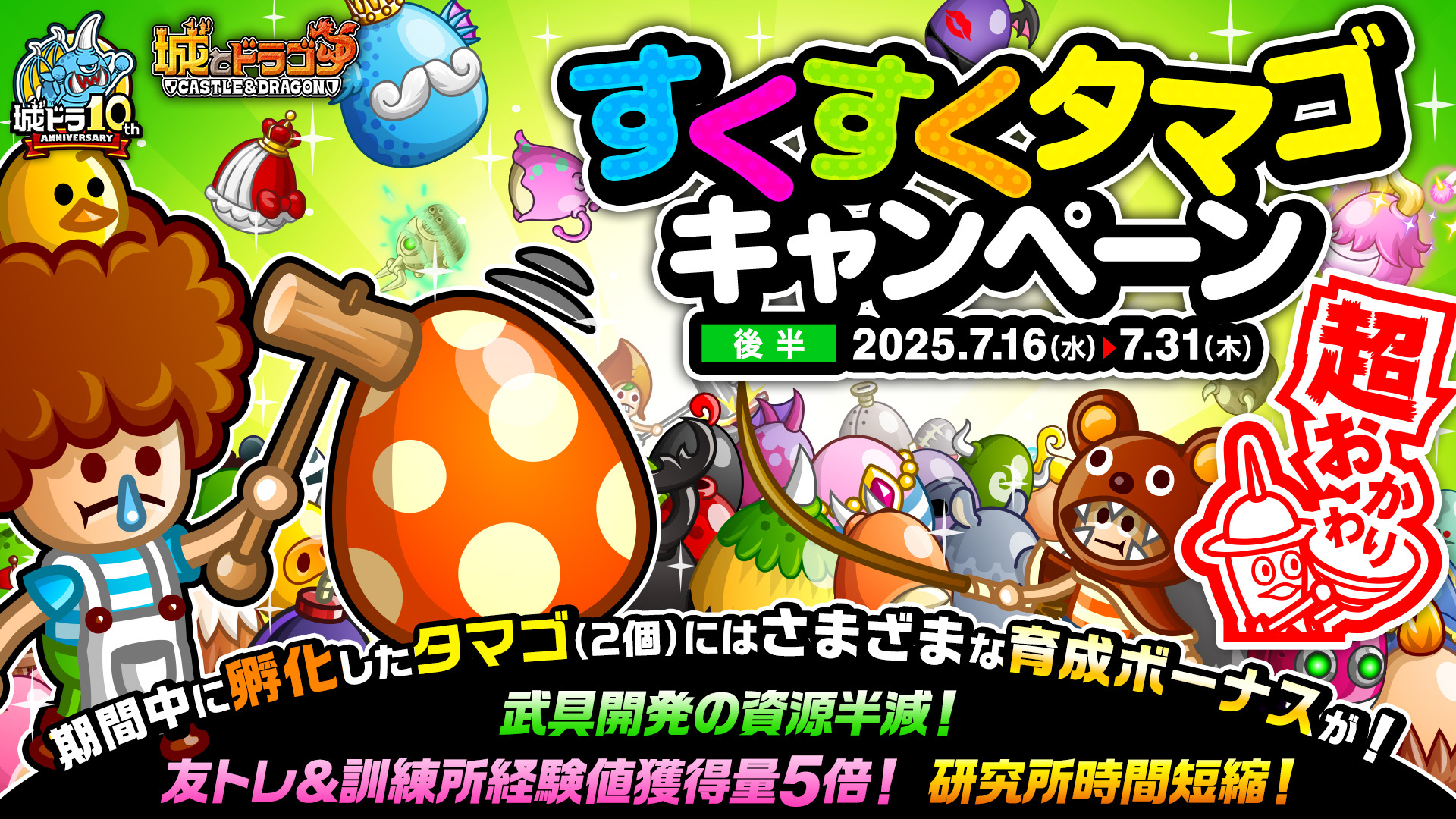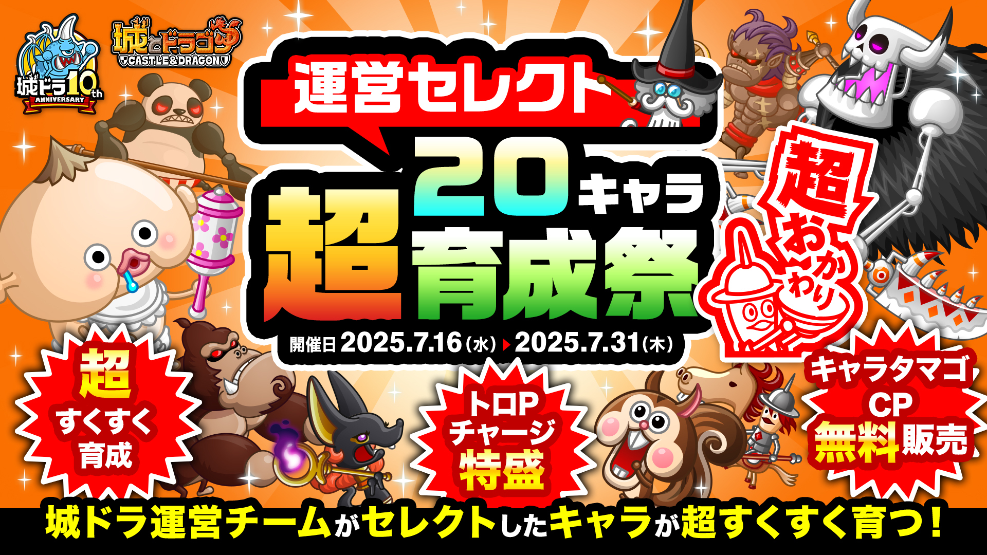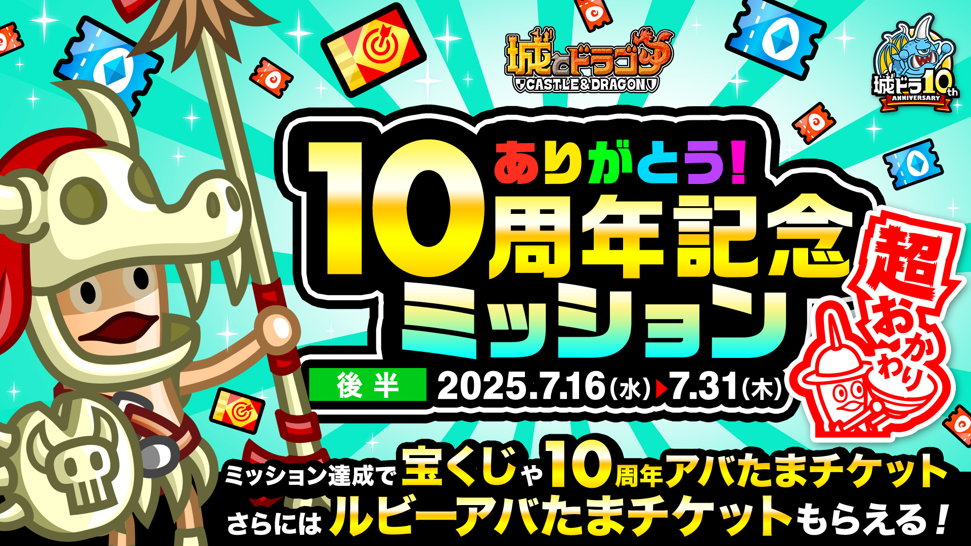 『城とドラゴン』で現在開催中の10.5周年キャンペーン「ありがとう10周年!城ドラ超感謝祭 超おかわり」の“後半”が、7月16日(水)0:00よりスタートします。特別なログインボーナスやミッションはもちろん、1日1回最大“10,100ルビー”が当たる!?「10周年ルビーアバたま」、最高“100,000ルビー”などが当たる「城ドラ宝くじ」が獲得可能なミッションも引き続き開催!さらに5日間で最大1,000ルビーを獲得できる「ルビー剣士登場ウィーク」や、厳選されたキャラがすくすく育つ「運営セレクト20キャラ超育成祭」も!10周年“超おかわり”の『城とドラゴン』で、ぜひお楽しみください。