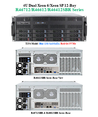 【4U ラックマウント, デュアル Intel Xeon 6700E CPU, Intel SoC PCH, 12*3.5/2.5” 12G SAS/SATA可脱着ベイ, 2*G5 PCIe/CXL2.0(X16)バス, 3*G5 PCIe/CXL2.0(X8)バス, 2*10GbE LAN, 1600W/1000W(1+1)冗長化電源】