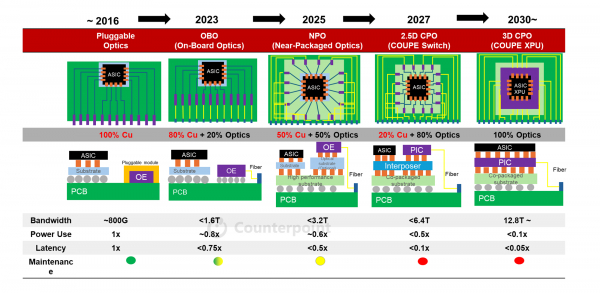プラグ可能な光ソリューションは2016年から市場に存在していましたが、OBO、NPO、CPOといった統合型ソリューションの登場によって、特にAIシステムにおける処理能力が大幅に向上し、消費電力を大きく削減しつつ、より高い帯域幅を実現しています。これにより、AIクラスタリングの拡張に不可欠な高密度・高帯域幅のファブリックが実現可能になりました。