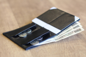 ツインカードスロットによりカードを4枚×2カ所に分け厚みを分散、だからといって財布全体の面積が大きくならずカードを2枚並列に並べただけの大きさに収めています。これは0.5mmまで薄くした強靭で伸縮性のある山羊革とカードポケットを正確に内側から縫製する技術により実現できた機能です。