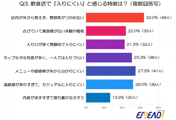 最も多かったのは「店内が外から見えず、雰囲気がつかめない」(32.0%・48人)で、店の雰囲気が分からないことが大きな心理的ハードルとなっていることが分かります。