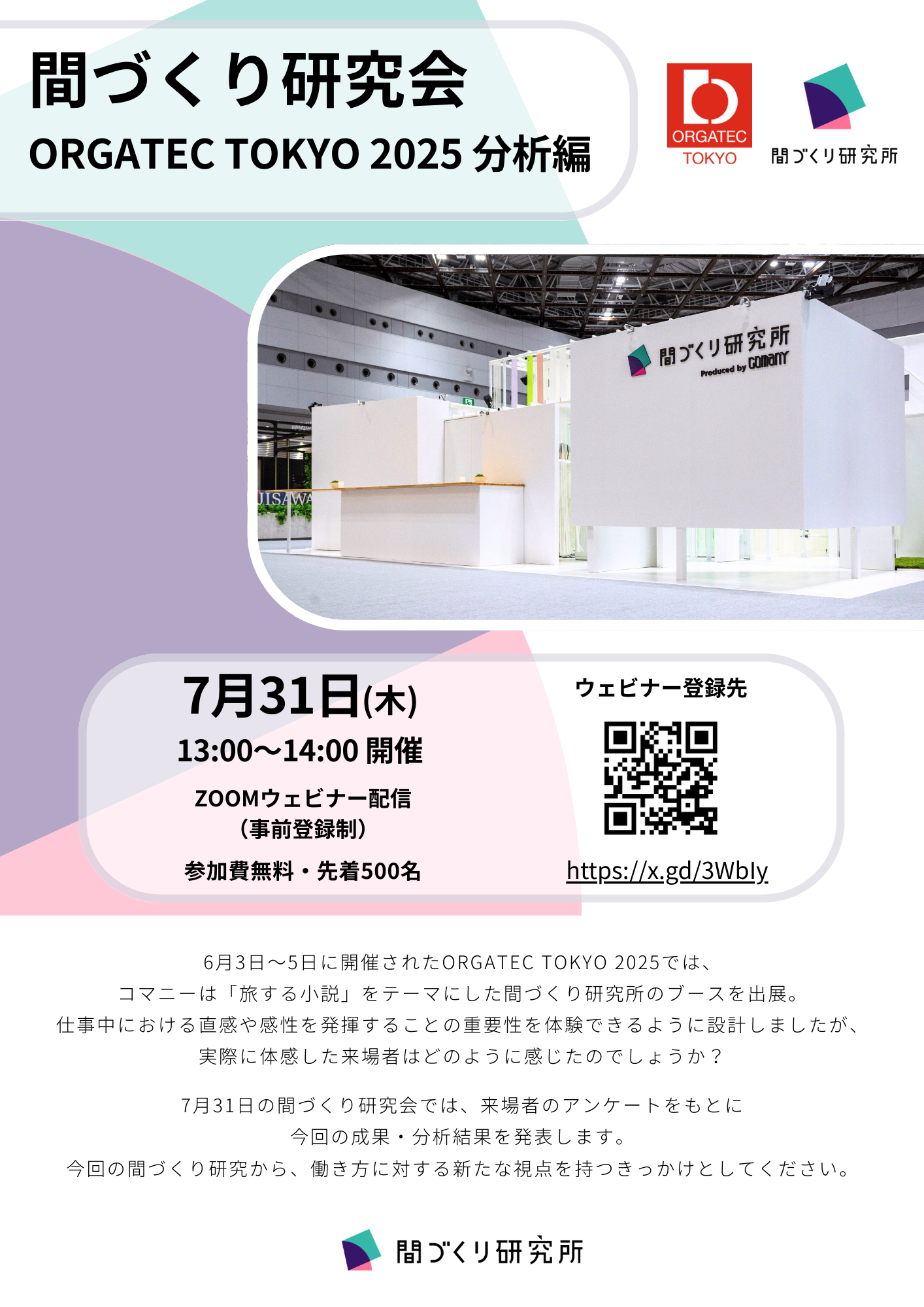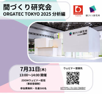 今回の研究会では、6月3日(火) ~ 5日(木)に東京ビックサイトにて開催されたドイツ発のオフィスおよびファシリティの国際専門展示会、 「オルガテック東京2025」に出展した当社の展示ブースをテーマに、「間づくり研究会 オルガテック東京2025 分析編」をオンラインウェビナー(参加費無料)で開催します。