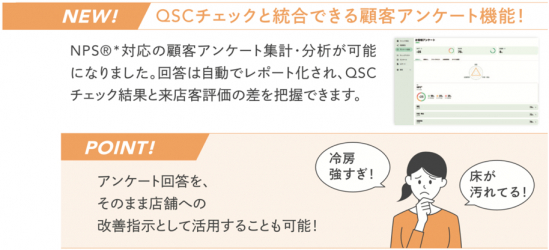 キロクルダッシュボード上で「顧客の評価」と「QSCスコア」の両方を比較分析することで、顧客と従業員間で感じ方に乖離がないか、知らないうちに顧客目線から遠ざかっていないかなどを検証することができます。今回、アンケートから得られた顧客からの指摘・意見は、キロクルから「改善指示」として即座に送付することもできるようになりました。また「キロクルアンケート」は、世界的にも活用が進んでいる「NPS(R)」(※)調査に対応しており、「NPS(R)」専用の設問を設定することで、自社の顧客ロイヤルティを調査することができます。