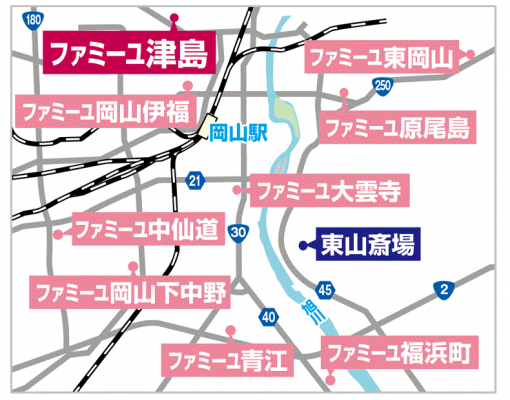 (地図)岡山市内のファミーユホールは9店舗の展開となる