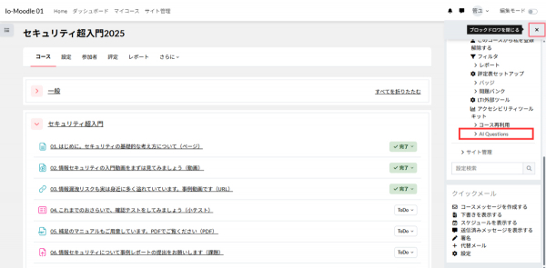 (1)管理者としてログインし、小テストを作成したい対象のコースを開きます。ブロックドロワを開き、「AI Text to Question Generator」をクリック。