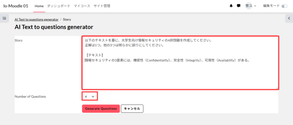 AIが生成した小テスト問題は、作成後すぐにMoodle上に自動で登録されます。