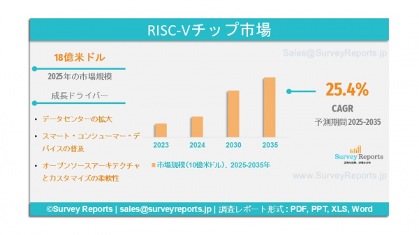 Surveyreportsの専門家によるRISC-Vチップ市場調査の分析によれば、2025年における同市場の規模は18億米ドルであった。また、2035年末までに118億米ドルに達すると見込まれている。2025年から2035年までの予測期間における年平均成長率(CAGR)は約25.4%と予測されている。