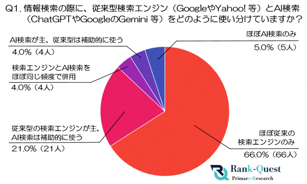 最も多かったのは「ほぼ従来の検索エンジンのみ」で66.0%(66人)。使い慣れた操作性や出典の明確さが評価されており、情報収集手段としての信頼感はいまだ根強いようです。