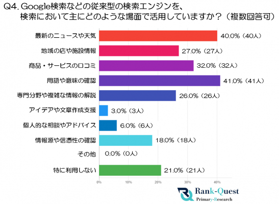最も多かったのは「用語や意味の確認」で41.0%(41人)、次いで「最新のニュースや天気」が40.0%(40人)となっており、即時性や基礎情報の確認を目的とした利用が中心となっています。従来型検索エンジンが持つ網羅性や多様な情報源が、こうした用途で特に重宝されていると考えられます。