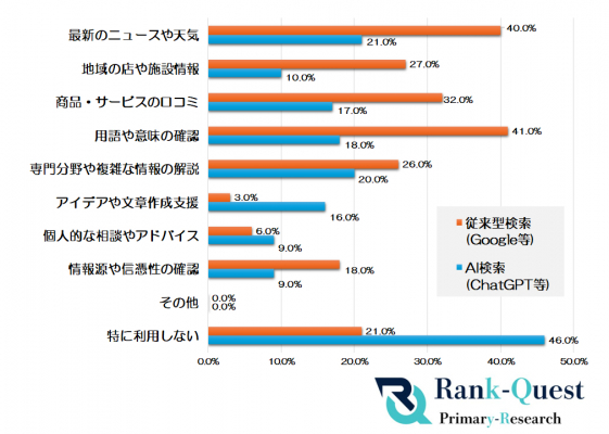 「用語や意味の確認」(41.0%)や「最新のニュースや天気」(40.0%)、「商品・サービスの口コミ」(32.0%)、「地域の店や施設情報」(27.0%)など、事実確認や網羅性・客観性が重視されるシーンでは従来型検索の圧倒的な信頼性が見て取れます。