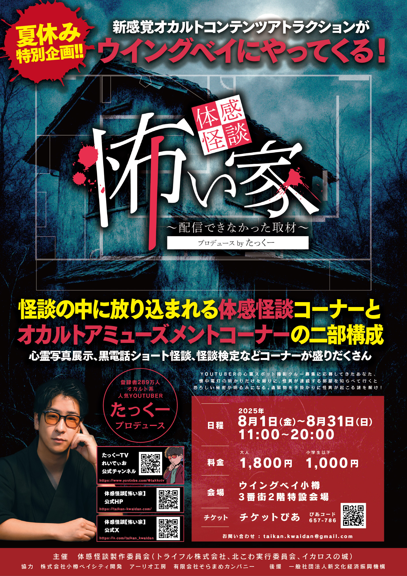 年間約6,500人を集客する怪談ライブ 「北海道 オカルト トーク ライブ北こわ」を企画運営するトライフル株式会社(本社:北海道札幌市白石区、代表取締役:堀口 哲行)は、2025年8月1日(金)より北海道・小樽のウイングベイ小樽にて、体験型ホラーアトラクションイベント『体感怪談「怖い家」~配信できなかった取材~』を開催いたします。