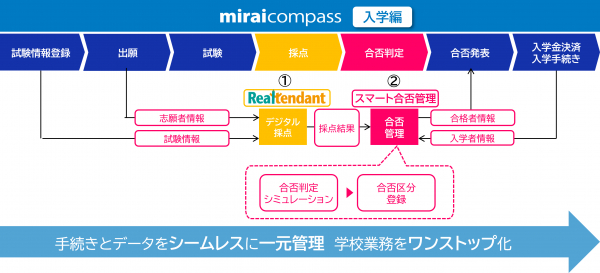 デジタル採点「リアテンダント(入試版)」((1))と合否管理「スマート合否管理」((2))のサービス提供開始により、出願~試験~採点~合否~入学手続までをワンストップで支援します。