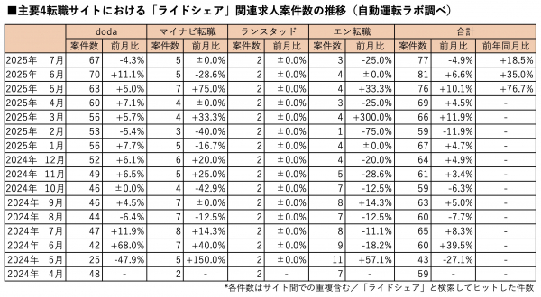 株式会社ストロボ(以下、当社/東京都港区 代表取締役 下山哲平)が運営するニュースメディア『自動運転ラボ』(https://jidounten-lab.com)は、ライドシェア関連求人案件数の最新調査(2025年7月末時点)をまとめましたので、結果を発表いたします。