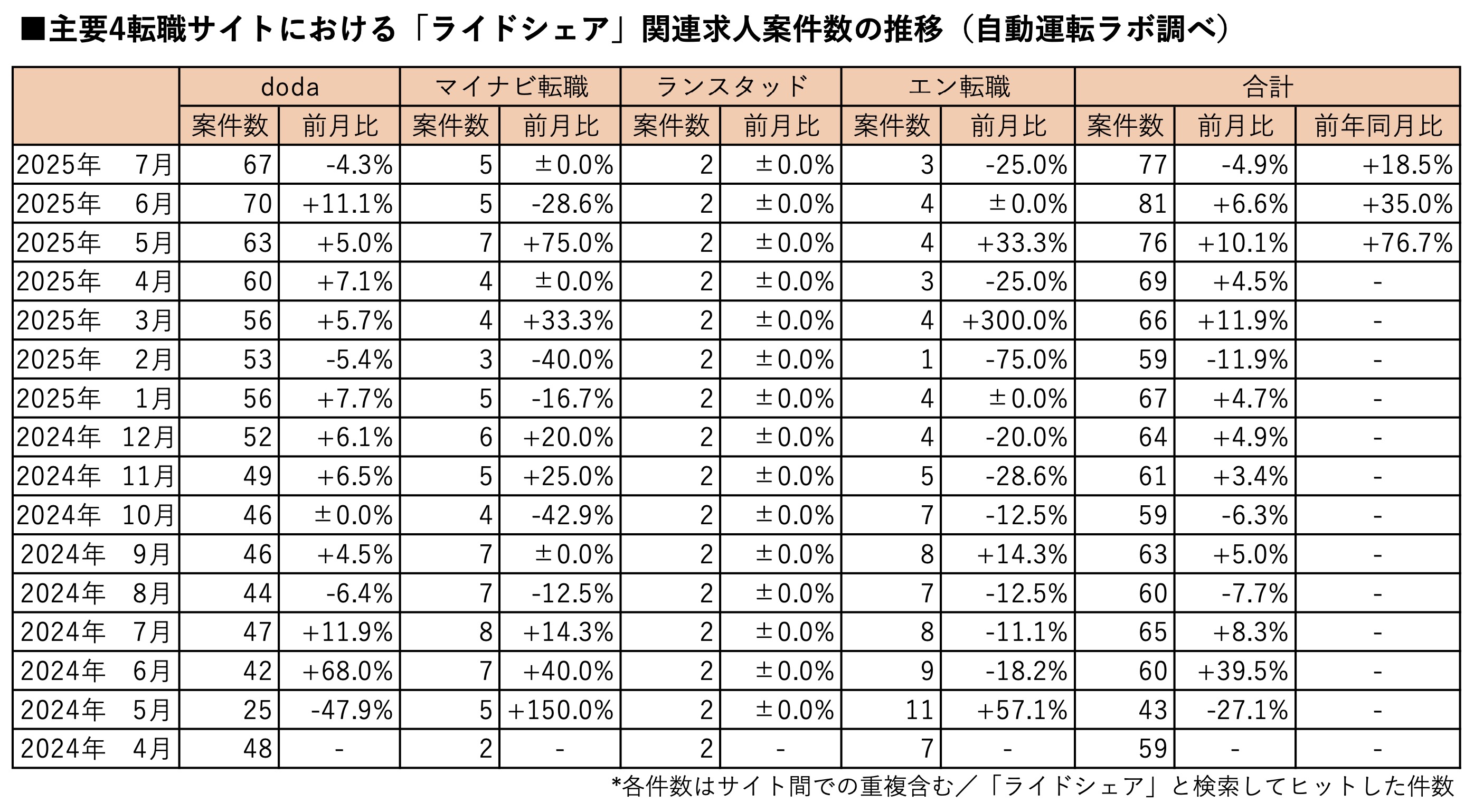 主要転職4サイトにおけるライドシェアの関連求人案件数(※「ライドシェア」と検索してヒットした求人)は2025年7月末時点で前月比4.9%減、前年同月比18.5%増の77件となりました。
