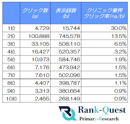 SEO支援で4,300社以上の実績を持つランクエスト(https://rank-quest.jp/column/column/how-to-seo/ )は、クリニックのクライアントサイトを対象に、2025年7月の検索順位ごとのクリック率(CTR)を計測しました。
