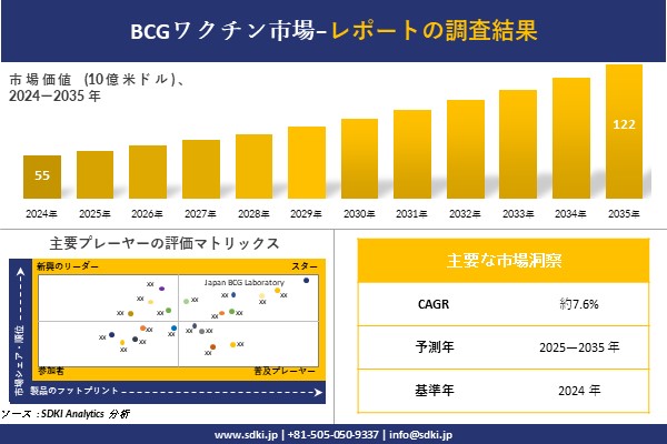 SDKI Analytics(本社:東京都渋谷区)は、このたび、2025年08月13に「BCGワクチン市場調査レポート:2025-2035年の市場規模、シェア、傾向の予測」を発表しました。BCGワクチンに関する市場調査レポートには、統計的及び分析的アプローチを使用した予測評価が含まれています。この調査レポートでは、一次及び二次調査方法を使用して分析された主要な業界洞察を通じて将来の傾向を理解できるようにすることで、主要な市場動向を読者に説明しています。
