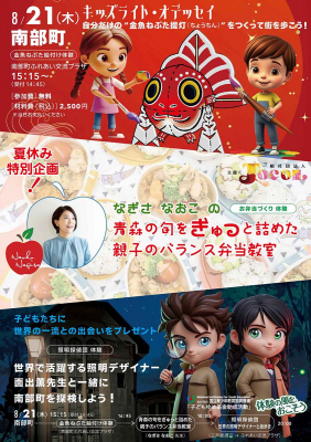 さらに探検に先立ち、食育料理家なぎさなおこ氏による「青森の旬をぎゅっと詰めた 親子のバランス弁当教室」も開かれる。栄養満点のお弁当を手に、歴史の眠る街を親子で探検する機会となる。