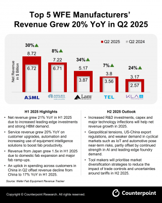 カウンターポイントリサーチでは、世界トップ5のウェーハファブ装置メーカーの2025年第2四半期の純売上高、2025年上半期のハイライト、そして2025年下半期の見通しに関するレポートを作成しました。ウェーハファブ装置には、成膜、エッチング、リソグラフィ、プロセス制御、洗浄、計測、試験装置が含まれます。