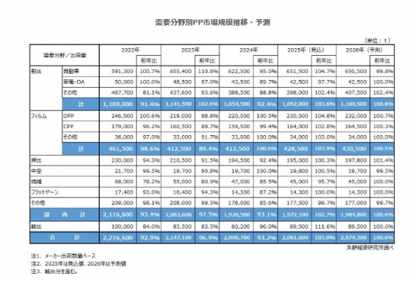 2025年の国内PP市場規模は前年比103.0%の206万1,600tを見込む。2024年に発生した自動車認証不正問題に伴う影響からの回復等により、市場は前年比プラスとなる見通しである。