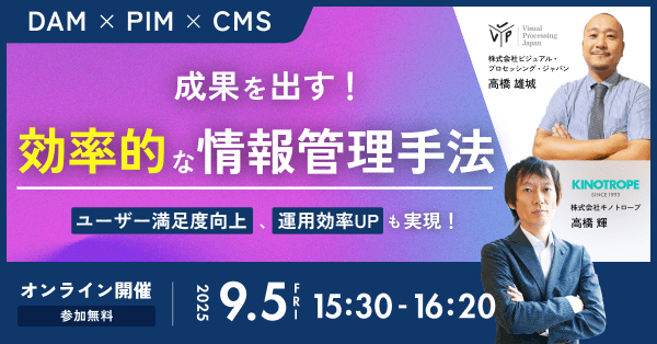 企業情報、商品情報、販促情報など企業が取扱う様々な情報は、タイムリーかつ正確に活用することで初めてその意味を成します。これらの情報を効率的に活用できないことは、余剰コストの増加、ブランディング低下、売上げ機会損失を招くためです。 このたびVPJでは、株式会社キノトロープさまと共催でオンラインセミナーを企画し、DAM×PIM×CMSによる効率的な情報管理・配信手法を紹介いたします。