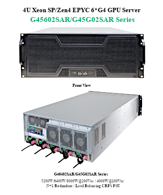 【4U ラックマウント, UP AMD Zen4 EPYC 9005/9004 CPU, AMD sIOD SoC PCH, 2*2.5”6G SATA内蔵固定ベイ, 7*G5 PCIe(X16)バス, 1*G5 PCIe(X8)バス, 6*シングルスロットGPU/6*ダブルスロットGPU/3*トリプルスロットGPUサポート, 2*10GbE LAN, 5200W(@200Vac)/4000W(@100Vac)CRPS(4+1)冗長化/負荷分散電源】