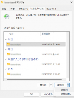 4.利用可能な以前のバージョンの一覧が表示されるので、削除する前の日付のバージョンを選択し、「復元」ボタンをクリックします。