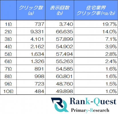 【SEO対策】で検索結果1位(※注1)の実績を持つランクエスト(https://rank-quest.jp/column/column/how-to-seo/ )は、2025年7月、住宅業界のクライアントサイトを対象に「検索順位別クリック率(CTR)」の大規模調査を実施しました。