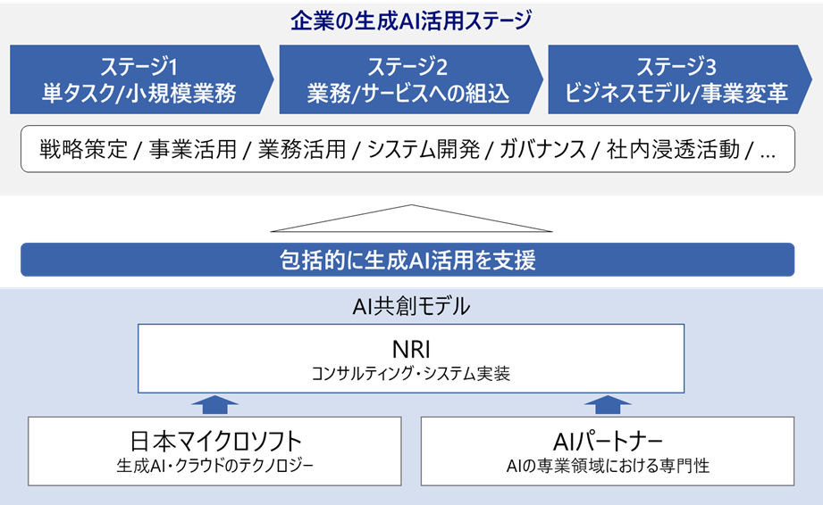 AI共創モデルとは、NRIのコンサルティングやシステム開発力に加え、日本マイクロソフトの生成AIおよびクラウド技術、AIパートナー企業の専門性を組み合わせ、これらの相乗効果を活かし、企業の生成AIの活用段階に応じて幅広く支援する新たな枠組みです。本モデルでは、企業の生成AI活用段階に応じて、以下の3ステージで支援を提供します。