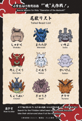 参加者は、S級犯罪組織「暁」の一員を目指し、エリア内に潜む9体の“尾獣”を探し出すウォークラリーイベントに参加頂きます。スタート時に渡される「尾獣リスト」を頼りに、尾獣が描かれた9つのパネルの撮影し、受付のスタッフに全ての写真を報告することで任務が完了となります。任務完了の記念には、「ちびっこ“暁”証明書」をプレゼント!1人1人の生き様に、敵ながら人気の高い「暁」の一員になれるチャンスかもしれません!
