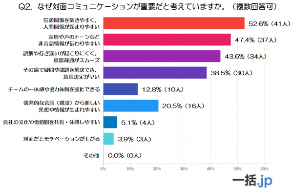 最も多かったのは、「信頼関係を築きやすく、人間関係が深まりやすい」とした人で、52.6%(41人)を占めました。対面コミュニケーションの価値は、人間関係の基盤を強める点にあると捉えられていることがわかります。