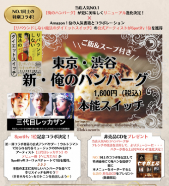 ”美と健康を耽美に推奨するコンセプト”の同グループは、第一弾コラボで人気書籍のアンバサダーも務めており、「食(俺のハンバーグ 渡なべ)」×「書籍(リバウンドしない魔法のダイエットスイッチ )」×「音楽(三代目レッカザン )」を掛け合わせて、食と書籍と音楽の三方面から「本能スイッチ」の起動を狙っていく。