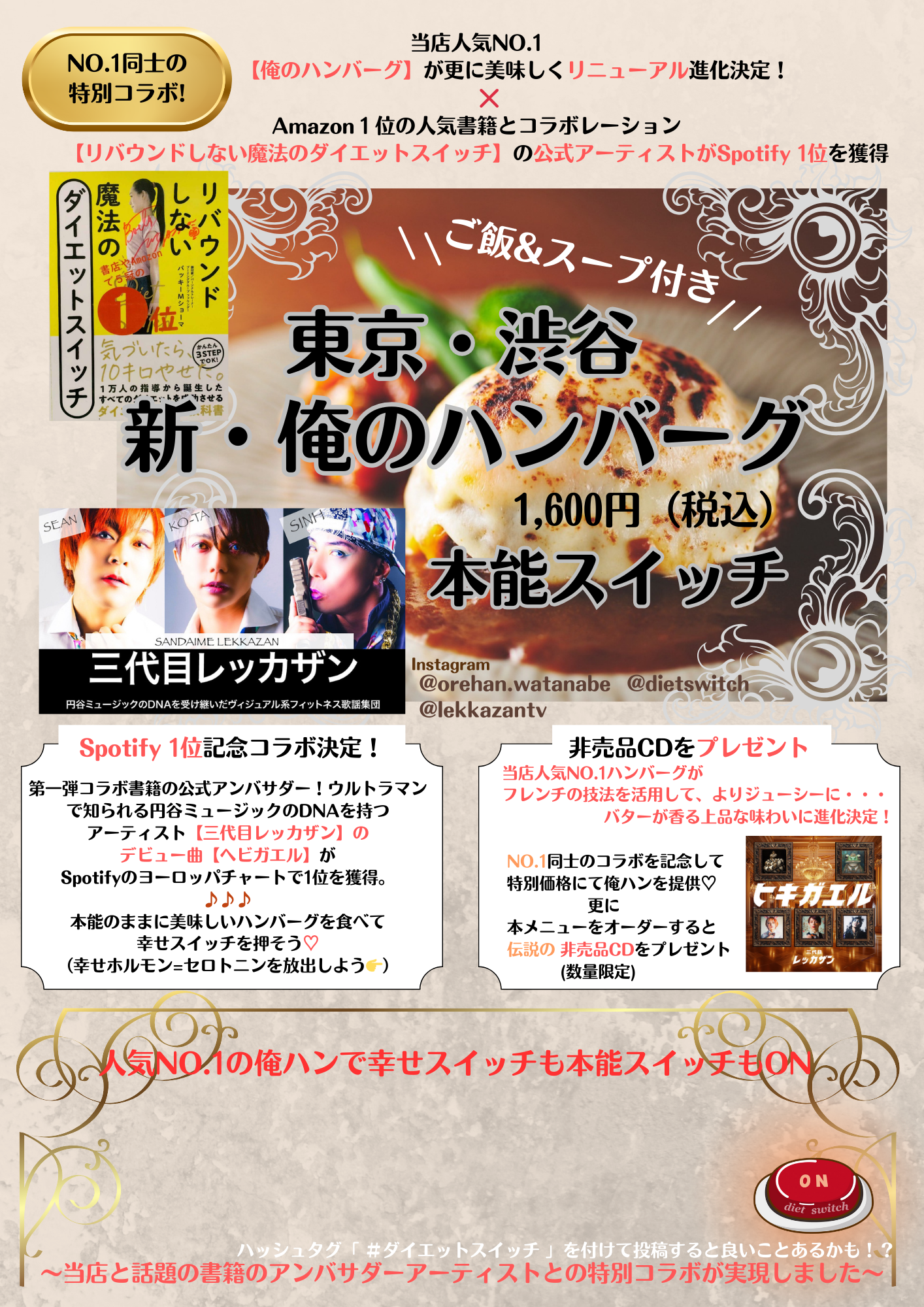”美と健康を耽美に推奨するコンセプト”の同グループは、第一弾コラボで人気書籍のアンバサダーも務めており、「食(俺のハンバーグ 渡なべ)」×「書籍(リバウンドしない魔法のダイエットスイッチ )」×「音楽(三代目レッカザン )」を掛け合わせて、食と書籍と音楽の三方面から「本能スイッチ」の起動を狙っていく。